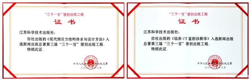 12月27日,第三届“三个一百”原创出版工程工作总结会在京召开,新闻出版总署表彰了298种入选本届“三个一百”原创出版工程的精品图书,江苏科学技术出版社《现代预应力结构体系与设计方法》与《临床CT鉴别诊断学》2种图书入选。